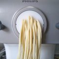 我が家ではお馴染みのヌードルメーカーに、いつものように『強力粉・水・卵・重曹・塩』をセットし製麺します。水分量を間違えたのか、麺が少し縮れ気味になってしまいました。