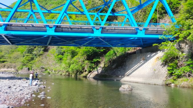 愛川橋は川はとても綺麗です。川辺は浅いので水遊びもできますが、奥の方は結構川底も深く、ダムの水が放流された時や大雨が降った後は下の写真のように結構流れが急になりますので、十分に注意しながら川遊びを楽しましょう。