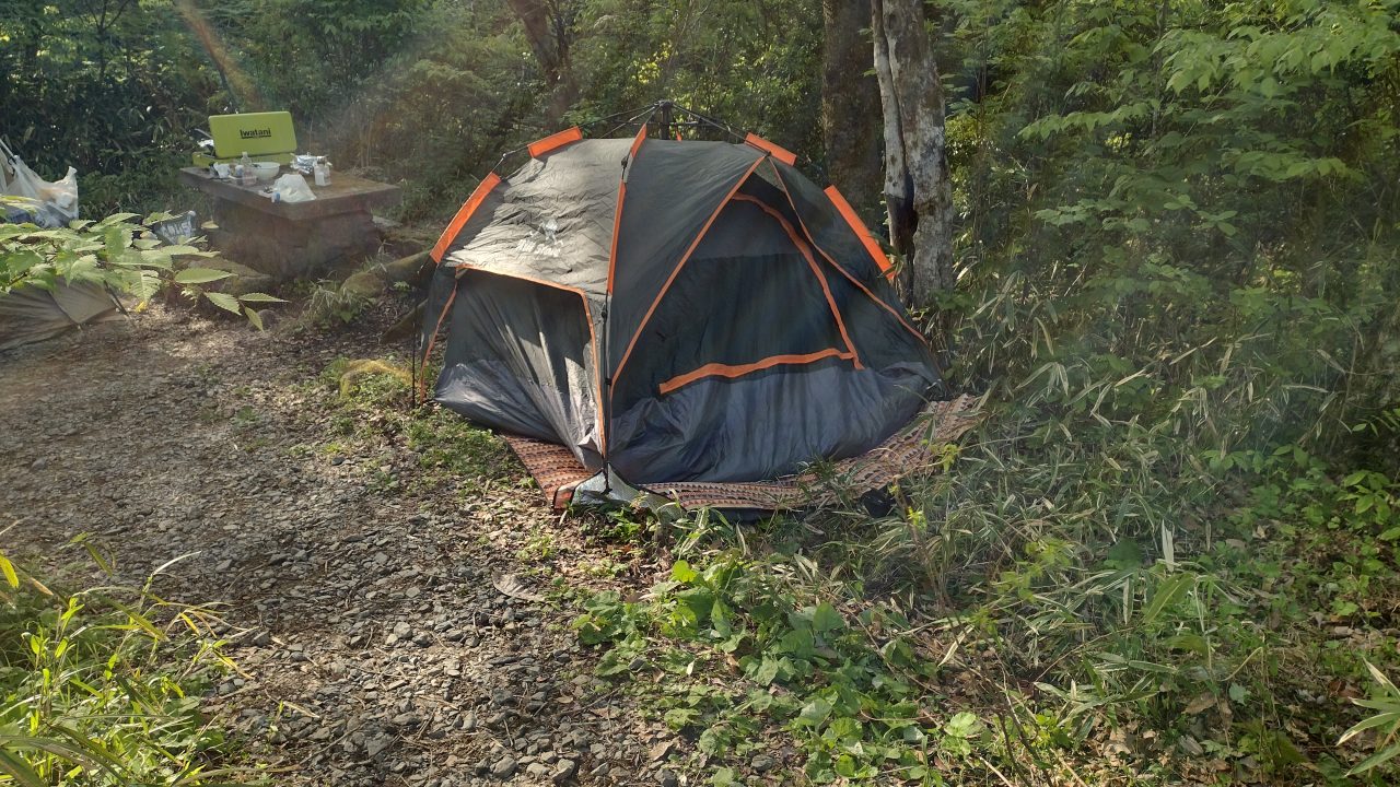 しかし、施設内の小さなスペースに目を凝らすと、なんとテント1張分だけの絶妙な空間を発見!隣のキャンパーさんともある程度を間隔をとれそうなので、荷物を抱えて急いで場所取りし、なんとか設営に成功しました。