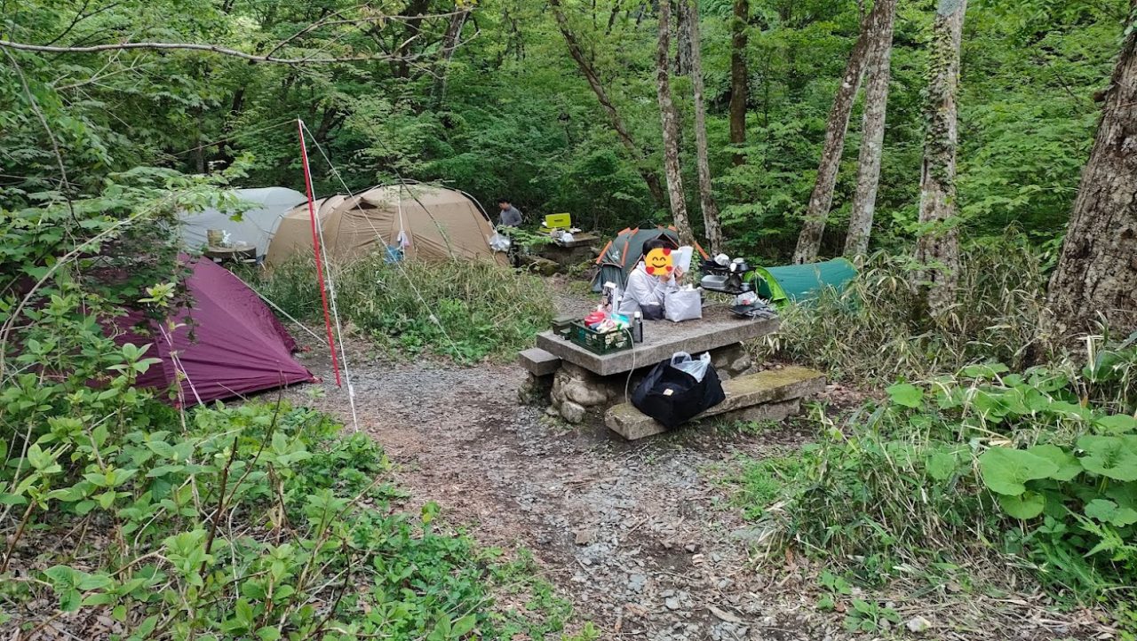 さらにありがたかったのが、場内に点在する石のテーブル。ちょうどテントを張った目の前のテーブルが空いていて、そこを確保できたおかげで、自然に囲まれながらリラックスした時間を過ごせる環境が整いました。
