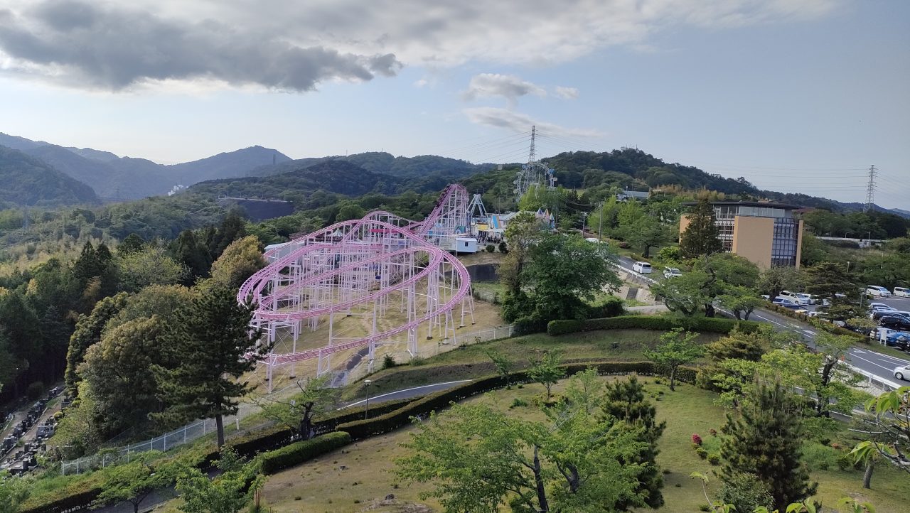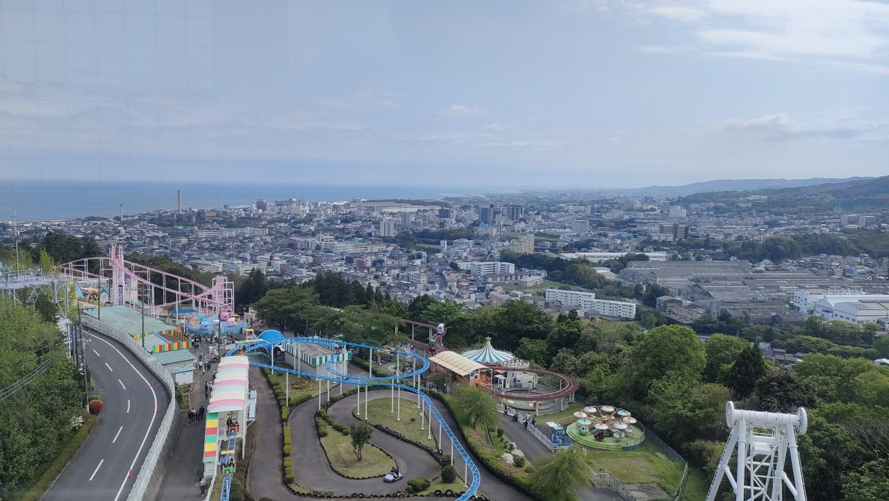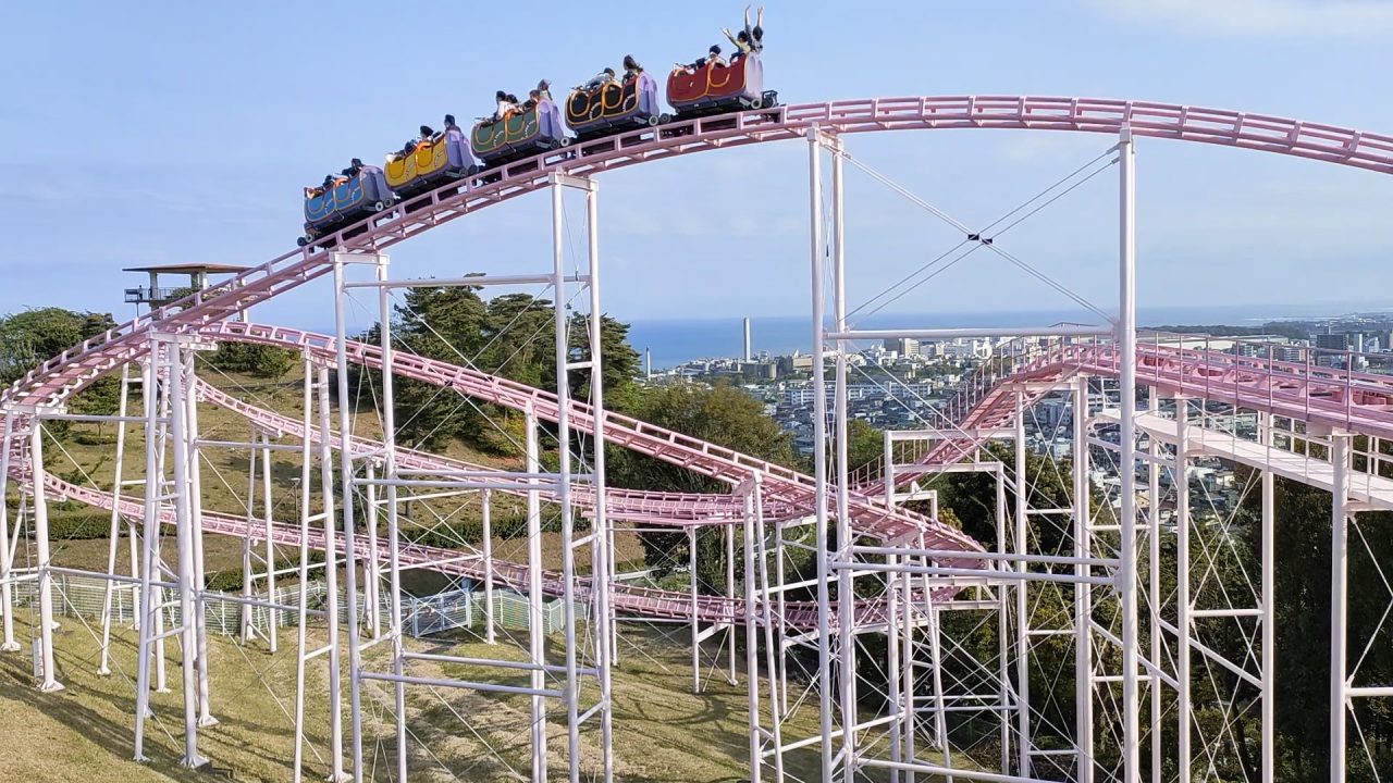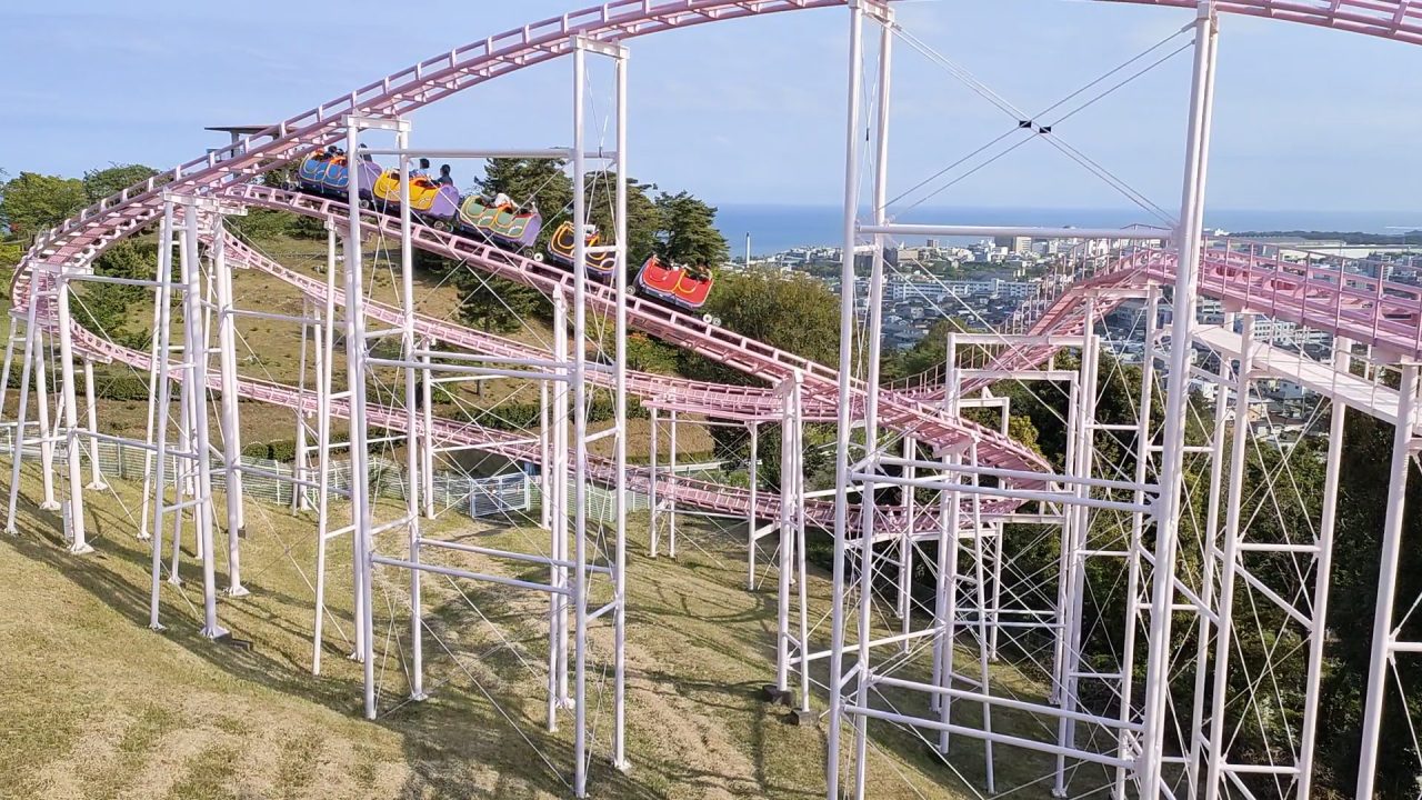 トコトコと坂を上り頂上まで着くと、遊園地が山の上に建っているので、日立市の街並みを一望でき、太平洋までみえてとても雄大で眺めがよいです。雄大な景色をみながら、ジェットコースターが走り出します。
