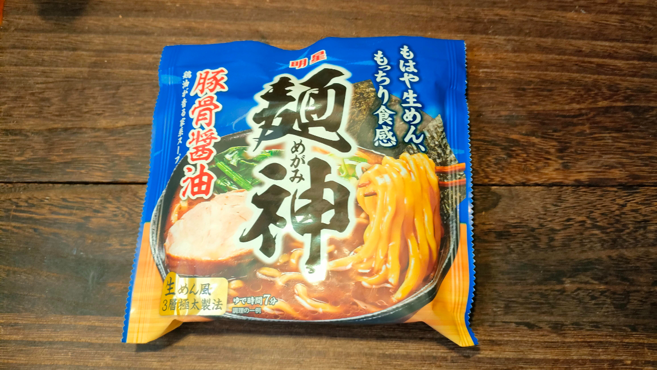 明星「麺神 豚骨醤油味」は、太麺の食感と安定した味わいが魅力の袋麺。